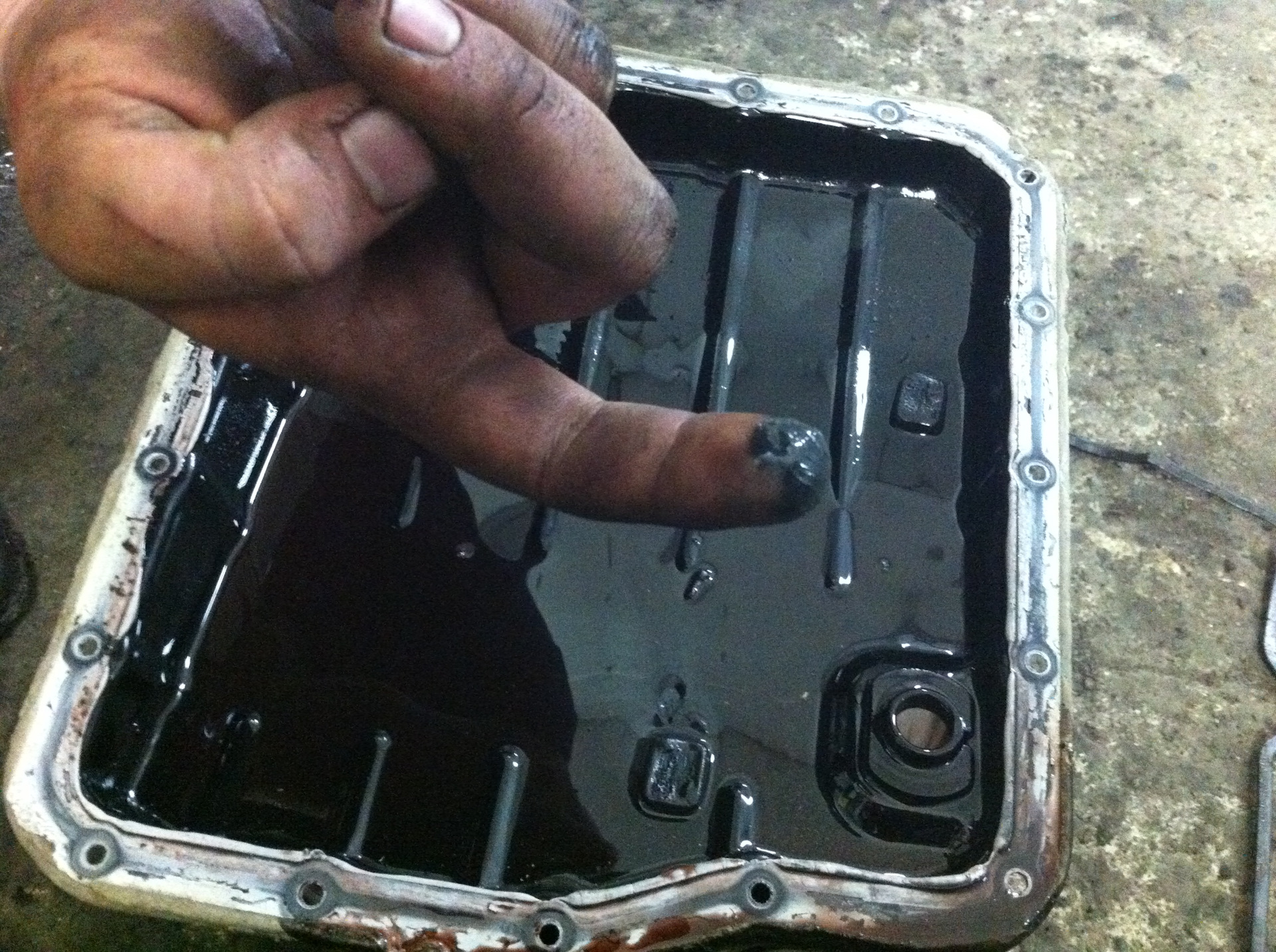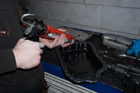 - после слива масла надо открутить болты поддона, оставив по одному фиксатору с каждой стороны в качестве «наживленных опор»;