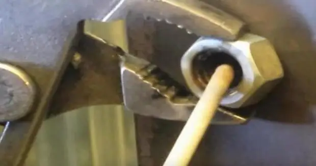 Также можно попробовать выкрутить болт с помощью двух отдельно просверленных отверстий, которые частично не перекрывают друг друга. Для этого нужно взять обычный гвоздь и согнуть из него скобу. Вставив данную скобу в отверстия и взяв разводной ключ можно попробовать выкрутить .