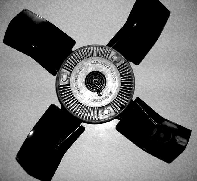 Мы сняли старый вентилятор с автомобиля, муфта вязкости здесь заварена, а лопасти загнуты. Старые муфты вязкости разжижались при высоких температурах: та жидкость, которая находится внутри, не справлялась с передачей крутящего момента, становилась слишком жидкая, и вентилятор проскальзывал, не обдувая радиатор.