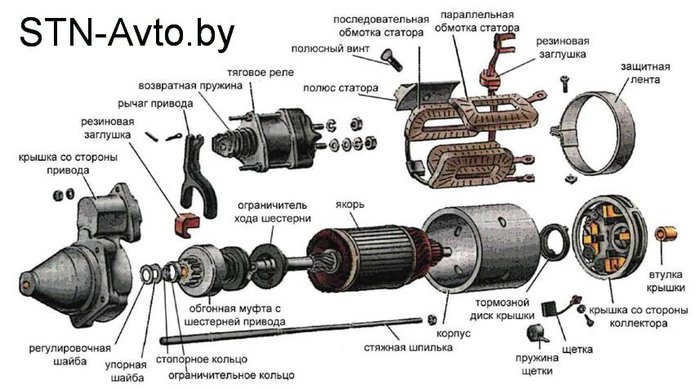 - Замыкание на массу щеточного узла (щеткодержателя) стартера.