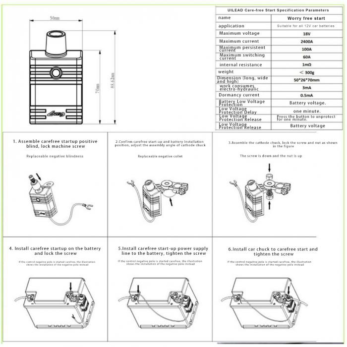 - Визуальная и звуковая сигнализация обратной полярности предупреждает о неправильном подключении к клеммам аккумулятора