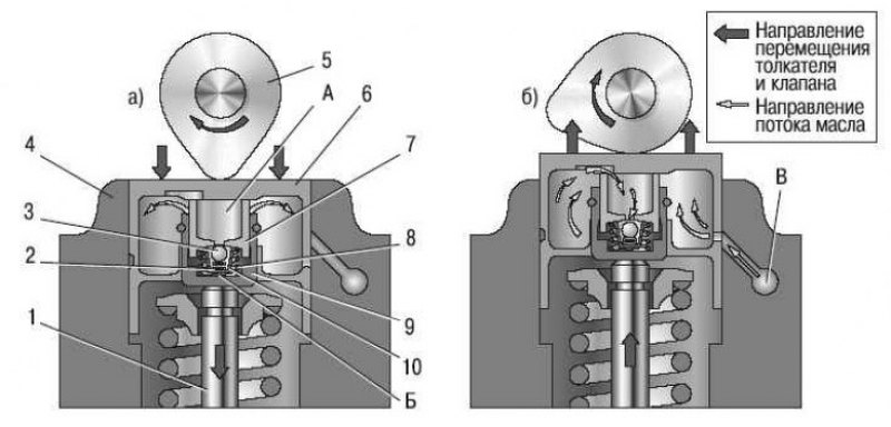 При совокупности этих неисправностей правильно отрегулировать клапаны сложно. Неравномерность износа шарнира, выработка на рабочей зоне кулачка и рокера ведут к изменениям в геометрии работы всего механизма. В таком случае для правильной работы двигателя предписанный регламент по регулировке приходится сокращать; - неисправность гидрокомпенсатора. Если по какой-либо из причин плунжер гидрокомпенсатора не выдвигается на необходимую величину, зазор между кулачком и толкателем будет слишком большим. Стучат гидрокомпенсаторы чаще всего в первые несколько секунд/минут после запуска, после чего посторонний звук исчезает.