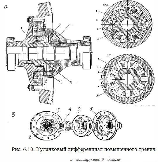 Кулачковые дифференциалы являются дифференциалами повышенного трения, так как имеют значительное внутреннее трение, которое позволяет передавать больший крутящий момент на небуксующее колесо и меньший на буксующее колесо. При этом суммарная тяговая сила на ведущих колесах автомобиля достигает максимального значения. Так, за счет повышенного внутреннего трения суммарная тяговая сила на ведущих колесах увеличивается на 10…15%, что способствует повышению тяговых свойств и проходимость автомобиля. Кулачковые дифференциалы относительно просты по конструкции и имеют небольшую массу.