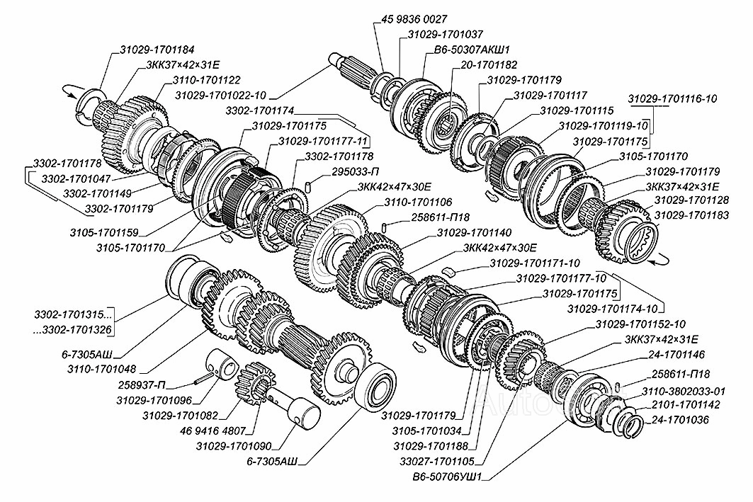 В состав КПП Газели входят валы (главный и промежуточный) и механизм переключения передач. Дополнительными запчастями являются различные шестерни, синхронизаторы, пружины, шарики.