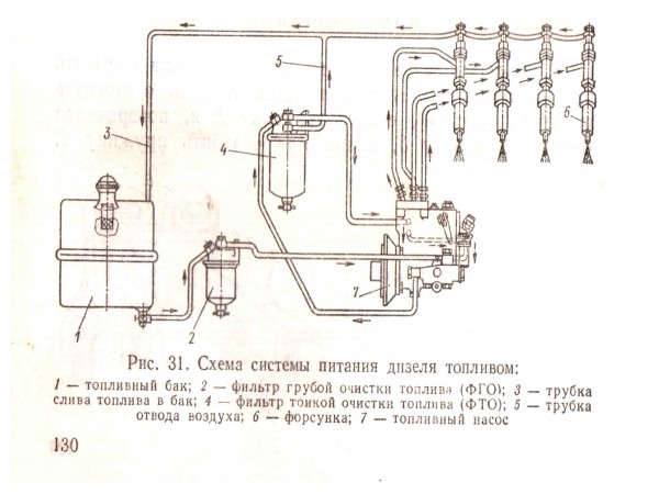 Насос по топливопроводам высокого давления подает топливо в форсунки в соответствии с порядком работы цилиндров двигателя (1—4—2—5—3—6). Независимо от частоты вращения коленчатого вала двигателя в каналах насоса поддерживается постоянное давление топлива 130—150 кН/м2 (1,3— 1,5 кгс/см2) вследствие работы перепускного клапана и жиклера фильтра тонкой очистки. Топливо, не использованное в насосе высокого давления, по топливопроводу сливается в бак. Топливопроводы служат для отвода в бак топлива, просочившегося между распылителем форсунки и иглой. Топливо, постоянно циркулирующее в системе питания, охлаждает головку насоса, отводит в бак топливо и воздух, попавший в систему.