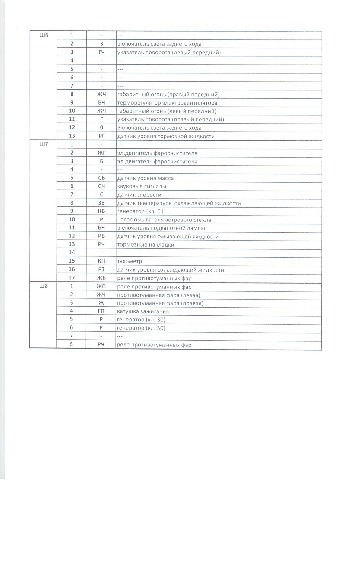 | 10. | 8А | Лампа правого габарита, лампа правого заднего габарита, выключатель противотуманок, контрольная лампа противотуманок |
