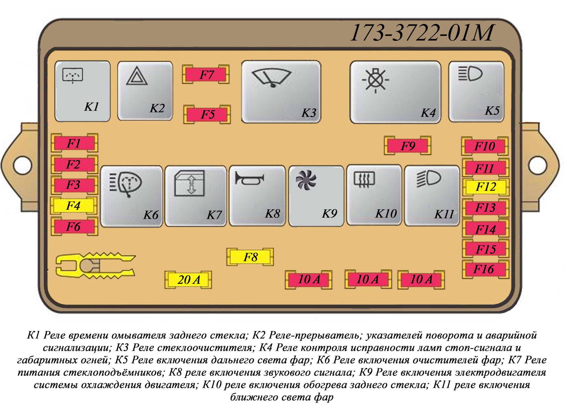 | F16 | 15А | Указатели поворотов и реле-прерыватель аварийки (при включенных поворотниках), контрольная лампа указателей поворотников, задние фонари заднего хода, моторедуктор и реле включения стеклоочистителей лобового стекла, контрольная лампа давления масла, контрольная лампа ручного тормоза, указатель температуры ОЖ, указатель уровня топлива, контрольная лампа резерва топлива, вольтметр |