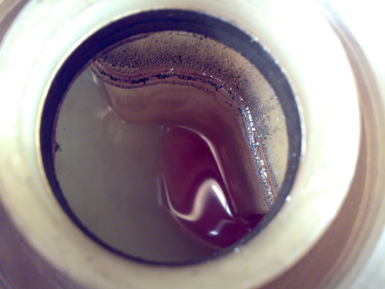 Во-вторых. Как только стало понятно, что происходит довольно быстрое изменение уровня жидкости, необходимо снять крышку из поддона и слить жидкость. Следует обратить внимание, что именно польется вначале. Если это будет водянистая часть, то следовательно тосол пошел в масло. Если вместе с ним вытекает маслянистая жидкость – следовательно масло проникло в антифриз.