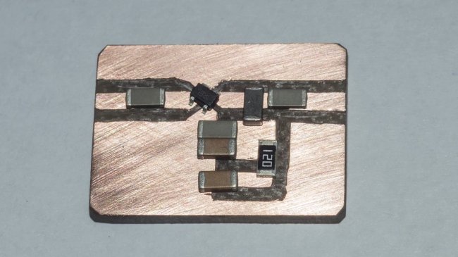 ΠΠ°Π»Π΅Π΅ Π²ΡΠ΅ Π·Π°Π»ΡΠΆΠΈΠ²Π°Π΅ΠΌ ΠΏΠ°ΡΠ»ΡΠ½ΠΈΠΊΠΎΠΌ ΠΈ ΠΏΡΠΈΠΏΠ°ΠΈΠ²Π°Π΅ΠΌ SMD ΡΠ»Π΅ΠΌΠ΅Π½ΡΡ ΡΠΈΠΏΠΎΡΠ°Π·ΠΌΠ΅ΡΠ° 0603. ΠΠΈΠΆΠ½ΡΡ ΡΡΠΎΡΠΎΠ½Ρ ΠΏΠ»Π°ΡΡ ΡΠΎΠ»ΡΠ³ΠΈ Π·Π°ΠΌΡΠΊΠ°Π΅ΠΌ Π½Π° ΠΎΠ±ΡΠΈΠΉ ΠΏΡΠΎΠ²ΠΎΠ΄, ΡΠ΅ΠΌ ΡΠ°ΠΌΡΠΌ ΡΠΊΡΠ°Π½ΠΈΡΡΠ΅ΠΌ ΠΏΠΎΠ΄Π»ΠΎΠΆΠΊΡ.