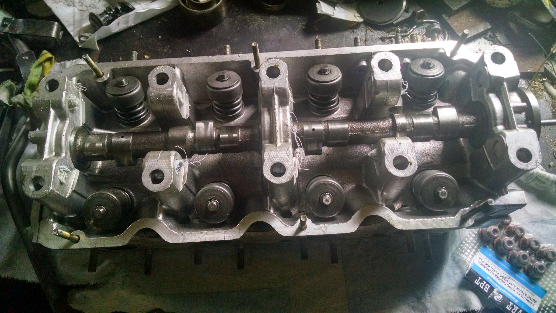 Теперь скидываю распредвал. Во избежание путаницы при последующей установке использовал контейнер, каждый отсек которого привязывал к номеру клапана куда и складывал все детали.