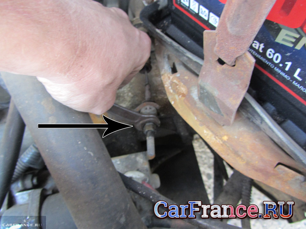 Фото. Коробка откручивается, стрелкой показано место нижнего болта, а с другой стороны нужно открутить гайку.Также можно поставить под двигатель пень или домкрат, но обычно двигатель не падает и отлично держится на одной подушке и глушителе. Также показан скрученный краб с тягой.