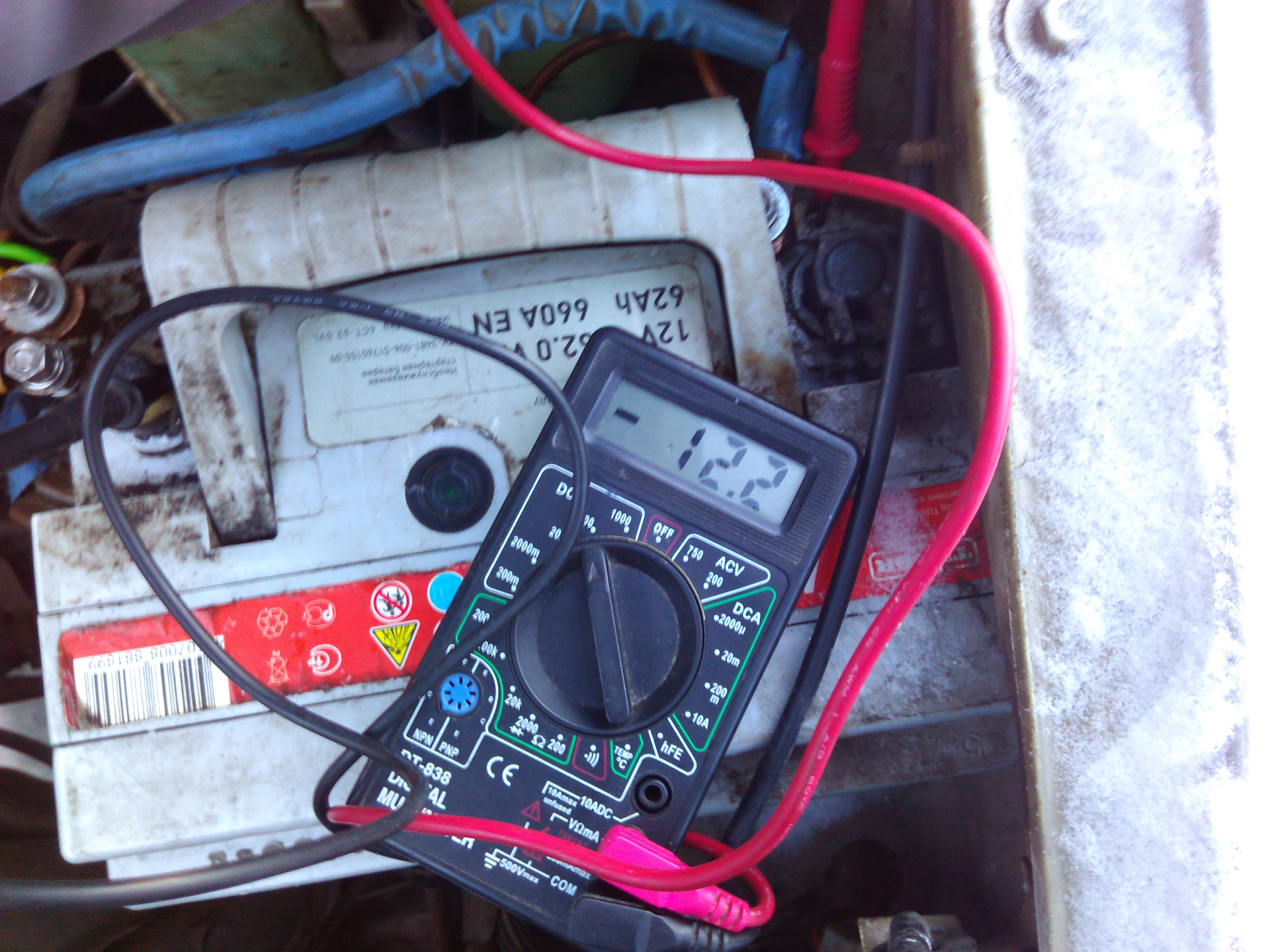 Проверка аккумулятора мультиметромДля мобилизации всех сил батареи есть небольшая хитрость. Нужно перед пуском включить дальний свет на 10-15 секунд. Заряд от этого сильно не упадет, зато электролит чуть разогреется, это поможет выдать максимум. Но во время самого пуска дальний свет, как и другие электропотребители (печка, подогревы, магнитофон), должны быть выключены, чтобы не распылять силы.
