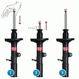 Затем нужно перевернуть стойку штоком вниз, подержать около 5 сек, выдвинуть шток, поднять амортизатор штоком вверх. Далее можно проверить качество его работы.