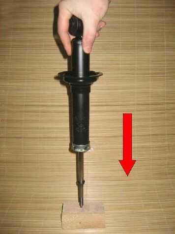 - Установить амортизатор штоком вниз, утопить шток до упора. Действовать нужно не спеша и плавно, без резких движений и рывков.