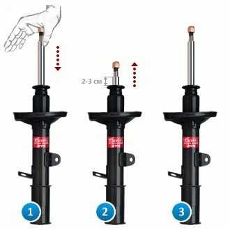 - Амортизатор устанавливается штоком вниз, затем через 5 секунд вытягивается шток до упора. Если же шток изначально находится в вытянутом положении, то нужно просто подержать его.