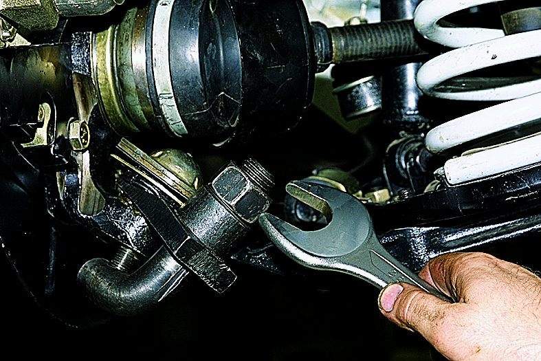 Если нет съемника, отвернув гайку пальца шаровой опоры, снимаем кронштейн тормозного шланга, как описано выше.