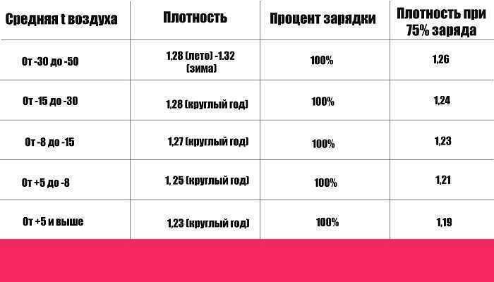 Важно! Плотность электролита должна соответствовать 1,27-1,29 г/см для районов с умеренным климатом.