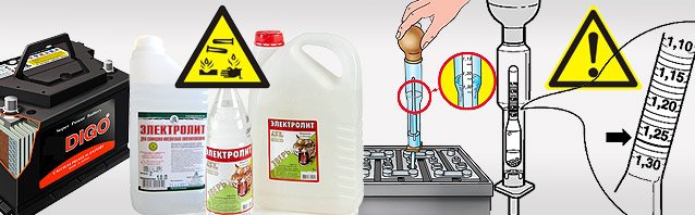 В магазинах и сервисных центрах продается уже готовый раствор серной кислоты, который и называется электролитом. Плотность его 1,29 г/см3. Работать с ним безопаснее, тут не действует правило «кислота льется в воду», как для растворов концентрацией свыше 40%. Поэтому в домашних условиях достаточными мерами предосторожности будут проведение работ на открытом воздухе или в помещении на сквозняке, в резиновых перчатках. По возможности нужно надевать очки.