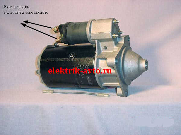 Замкнуть стартер напрямую можно путем соединения с АКБ или через контакты. Оба варианта рабочие, если якорь устройства не повреждён.