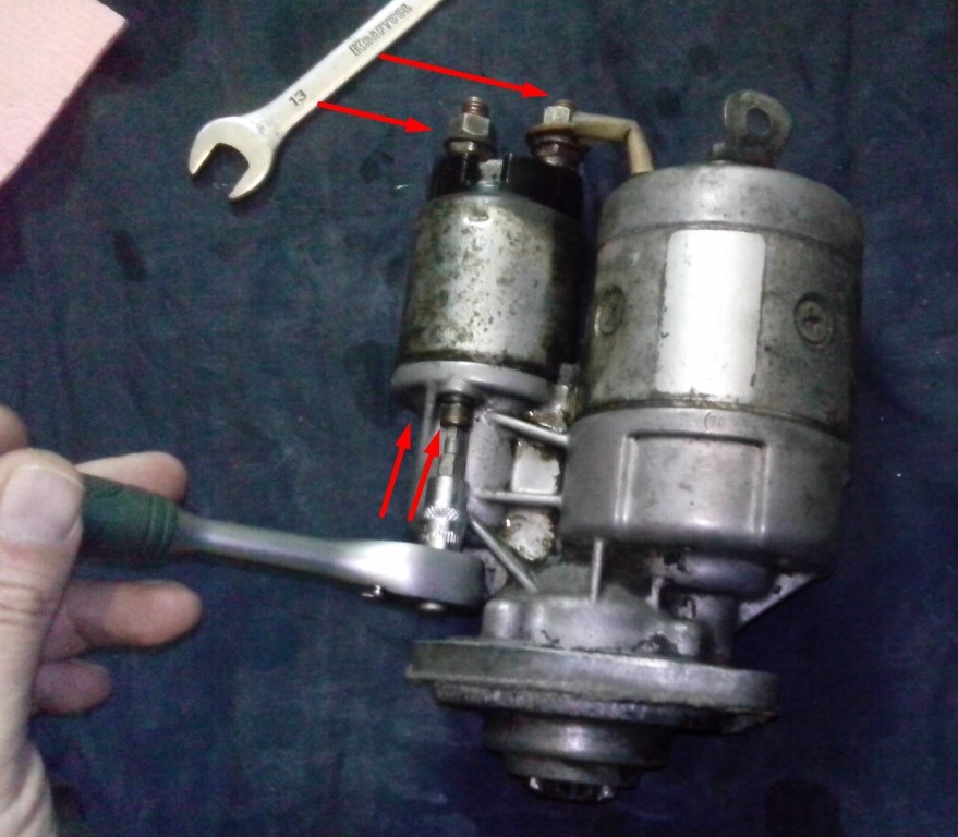 Если неисправно тяговое реле, используется метод прямого замыкания любым металлическим стержнем нужной длины. Это может быть отвёртка, гаечный ключ или монтировка. О проблемах со втягивающим свидетельствует характерное пощёлкивание во время поворота ключа в замке зажигания. Стартер в этот момент неспособен провернуть коленвал, так как зубья бендикса не цепляются за венец маховика. Замкнув силовые клеммы стартера, удастся пустить ток на электрообмотки напрямую. Гаечный ключ или отвёртка возьмут на себя функции тягового реле.