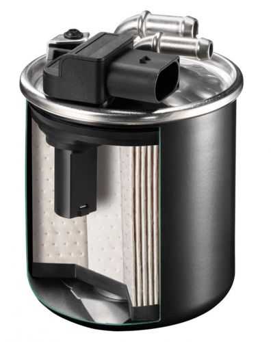 «Конструктивно топливные фильтры дизельного топлива выполняются быстросменными. В качестве сменных элементов применяются фильтры с болтовым креплением, проходные фильтры и фильтрующие элементы, устанавливаемые в корпусах из алюминия, пластмассы или листовой стали (в соответствии к повышенным требованиям к предотвращению тяжелых последствий при столкновениях). Предпочтение отдается спиральным V-образным фильтрующим элементам. Отделение воды осуществляется посредством коалесценции на фильтрующем материале (образование капель воды вследствие различных поверхностных натяжений воды и топлива). Вода скапливается в камере в нижней части корпуса фильтра и сливается вручную через сливную пробку или электромагнитный клапан, управляемый кнопкой».