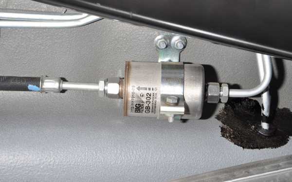 Топливный фильтр под днищем автомобиля с резьбовыми наконечниками.