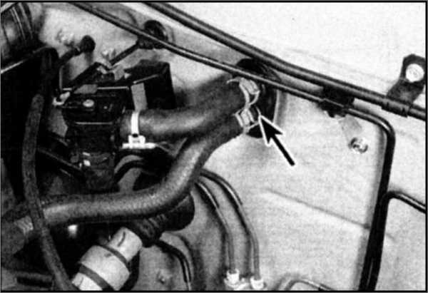 - Сначала необходимо ослабить затяжку хомута патрубка, соединяющего верхнюю трубку радиатора печки с системой охлаждения.