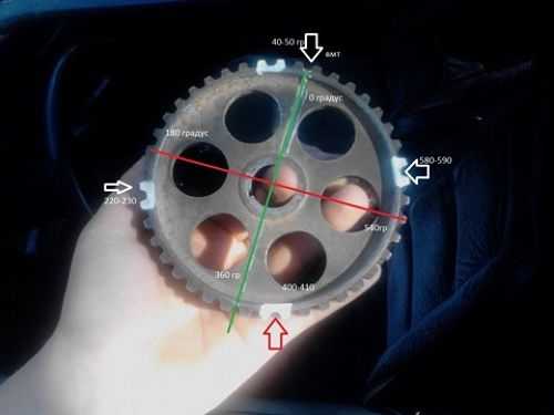 Для отсчета углов удобно использовать зубцы шкива: 3 зуба по распредвалу приблизительно равны 50 градусам по коленвалу.