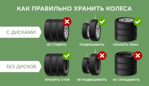 Бортированные колёса нужно хранить накачанными и подвешенными на стены сухого и тёмного помещения (чердак или гараж), а шины снятые с дисков – в стопках или вертикально. В последнем случае время от времени их нужно менять местами или проворачивать. Кроме того, сегодня многие автоцентры предлагают услугу хранения покрышек, для чего они имеют специализированные помещения, оборудованные особыми стеллажами. При таком хранении и соблюдении всех правил, автомобильная резина может сохранять эластичность до десяти лет.