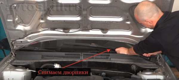 - Нужно снять все облицовочные панели вокруг лобового стекла, молдинг, дворники, кожух под дворниками (жабо), зеркало заднего вида.
