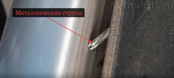 - Изнутри салона просунуть один конец струны через герметик примерно на 10 см ниже одного из верхних углов. Для этого применяется специальное шило, которое идёт в комплекте со струной.