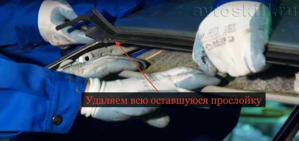 - После срезки стекла, для полного удаления старого клея нужно пройтись ножом. При очистке старайтесь максимально аккуратно счищать остатки герметика, дабы не повредить лакокрасочное покрытие, а также не повредить пластик обшивки салона.