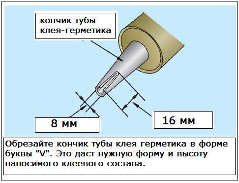 Носик срезается под углом 45 градусов буквой «V». Такая форма носика поможет нанести клей-герметик нужной формы и высоты. Клей, нанесённый полоской, имеющей закруглённую форму может после вклеивания стекла оставлять пропуски, что приведёт к протечкам. К тому же клей-герметик с круглой формой сложнее равномерно прижать, что также может привести к негерметичности и протечкам. Когда клей нанесён в форме буквы «V», то при прижатии стекла в нём не образуется пузырьков воздуха и он равномерно распределяется.