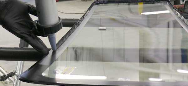 - Перевернув стекло обратно, устанавливаем баллончик клея в специальный пистолет и наносим на подготовленную поверхность стекла клей-герметик без разрывов и с равномерной высотой гребня (некоторые мастера наносят клей не на стекло, а на кузов в месте установки).