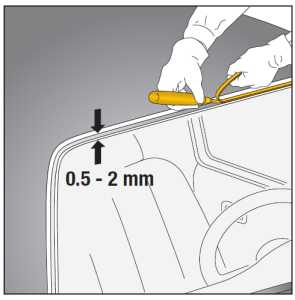 V-образный вырез кончика носика клея-герметика должен быть того же размера или на 3 мм больше, чем расстояние между посадочным местом лобового стекла и плоскостью крыши. Для проверки правильности выреза, можно поместить кончик на посадочное место в верхней части проёма и посмотреть совпадает ли острая часть выреза буквой «V» с краем крыши. Если вырез получился короче, чем нужно, то можно его сделать немного больше. Правильный вырез даст нужную высоту клея при нанесении и стекло ляжет в проём на нужную глубину.