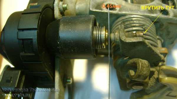 В итоге должно получиться следующее: между штоком и концевиком акселератора должен появиться зазор. В эту щель необходимо вставить щуп размерами 0,45-0,5мм. Если в этот момент мультиметр не отобразит «короткое замыкание» – расстояние между ними слишком большое. В таком случае необходимо отрегулировать положение концевика акселератора. Делается это при помощи специального винта, который расположен под моновпрыском.