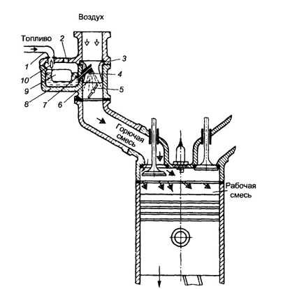 Образование горючей смеси в смесительной камере карбюратора происходит не в полном объеме. Часть топлива в виде капелек не успевает испариться и перемешаться с воздухом. Неиспарив-шиеся капельки топлива движутся в потоке воздуха и оседают на стенках смесительной камеры и впускного трубопровода. Топливо, осевшее на стенки, образует пленку, которая движется с малой скоростью. Чтобы испарить пленку топлива, впускной трубопровод при работе двигателя подогревается. Чаще всего используется жидкостный подогрев (от системы охлаждения двигателя) или подогрев теплом отработавших газов. Таким образом, можно считать, что образование горючей смеси заканчивается в конце впускного трубопровода двигателя.