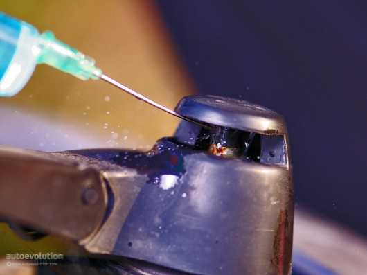 — Вставьте иглу в крошечное отверстие сопла форсунки и распылите жидкость шприцом нажимая поршень. Таким образом вы подадите под давлением жидкость в систему омывателя лобового стекла. Старайтесь влить жидкость под максимальным давлением. Для этого как можно быстрее нажмите поршень шприца вниз.
