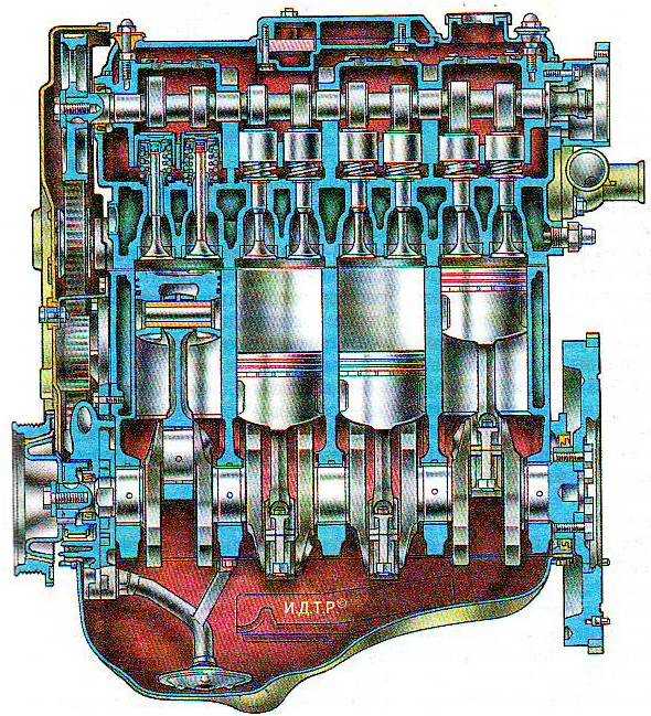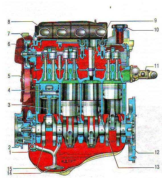 Осевой разрез мотора ВАЗ-21126: 1 – насос масляный; 2 – ремень генераторов; 3 – шатун; 4 – поршневой палец; 5 – ремень привода ГРМ; 6 – крышка ГРМ; 7 – шкив распределительного вала; 8 – впуск; 9 – свечной колодец; 10 – масляная крышка; 11 – термостат; 12 – маховик; 13 – форсунка охлаждения днища поршня; 14 – маслоприёмник; 15 – коленвал.