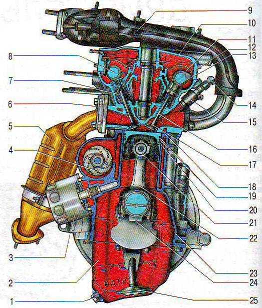 Перпендикулярный разрез мотора ВАЗ-21126: 1 – сливная пробка сливного; 2 – масленый картер; 3 – масляный фильтр; 4 – водяная помпа; 5 – катколлектор; 6 – выпускной клапан; 7 – клапанная пружина; 8 – распредвал выпускных клапанов; 9 – впуск; 10 – крышка ГБЦ; 11 – распредвал впускных клапанов; 12 – гидравлический толкатель клапана; 13 – корпус подшипников распределительных валов; 14 – форсуночная рейка; 15 – форсунка; 16 – направляющая втулка клапана; 17 – впускной клапан; 18 – прокладка ГБЦ; 19 – компрессионные кольца; 20 – маслосъемное кольцо; 21 – поршневой палец; 22 – шатун; 23 – блок цилиндра; 24 – крышка шатуна; 25 – маслоприёмник.