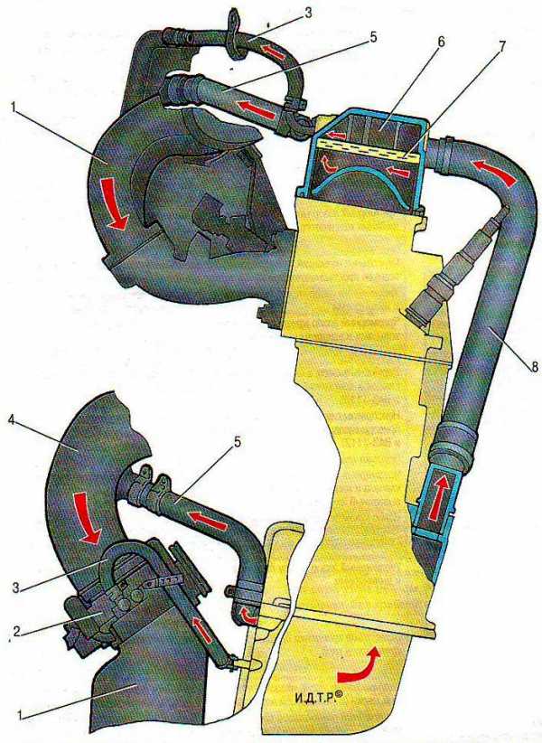 Схема вентиляции картера мотора: 1 – отводная труба; 2 – дроссельная заслонка; 3 –сапун вентиляции картерных газов; 4 – воздухоподводящий рукав; 5 – сапун большого контура системы вентиляции; 6 – крышка ГБЦ; 7 – маслоотделитель; 8 – вытяжной сапун.