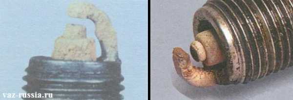 Если вы обнаружили то что электроды у свечи немного поплавились, то в таком случае у вас выставлено слишком ранее зажигание которое и может приводить к этому, в этом случае на свечах так же изолятор может быть чисто белого цвета или же может так же быть задразнён, лечится всё это заменой свечи на той марки которая должна быть ввёрнута в цилиндр (Это только нужно делать в том случае, если вы завернули свечу с другой маркировкой которая не подходит для двигателя вашего автомобиля), кроме этого рекомендуем вам проверить работу систем охлаждения и системы смазки, так же рекомендуем вам прочистить форсунки (Только инжектора касается) если они сильно загрязнены и заменить топливный фильтр, на карбюраторных же автомобилях проверьте правильно ли установлены углы зажигания и состав топливовоздушной смеси.