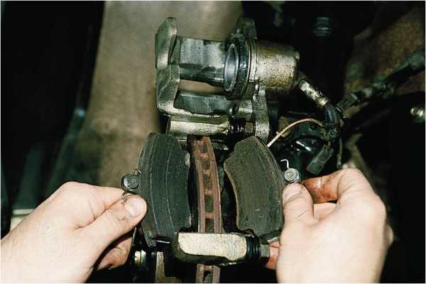 - Ослабляем один из болтов и полностью выкручиваем другой. Отодвигаем кожух суппорта с фиксирующими скобами и достаем старые колодки.