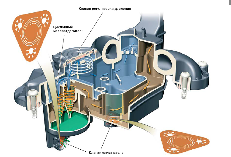 Циклонный маслоотделитель приводит воздух во вращательное движение. Благодаря возникающей центробежной силе масляный туман ударяется о стенку маслоотделителя. Там образуются капли масла, которые по каналу в картере стекают в масляный поддон. Очищенный от масляного тумана воздуха через клапан регулировки давления подводится к каналу забора воздуха.