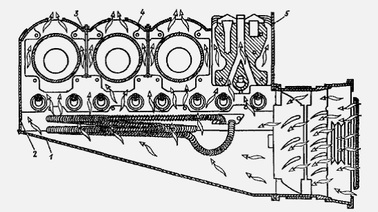 При работе двигателя воздух поступает к вентилятору через направляющий аппарат, а затем нагнетается под кожух. От кожуха воздушный поток с большой скоростью направленно подается к цилиндрам Ц головкам, проходит между ребрами и охлаждает нагретые узлы.
