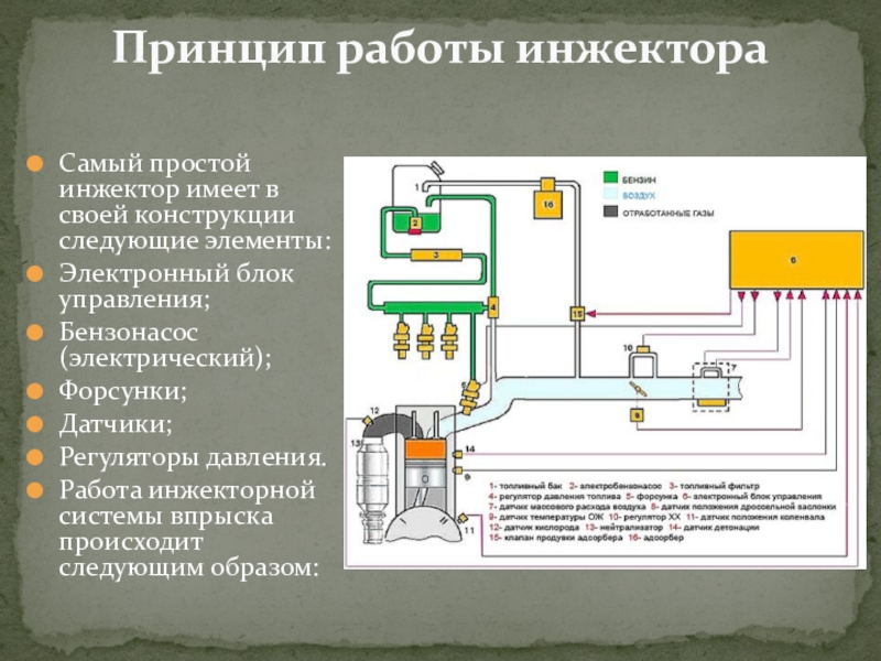 В прошлом для подачи топлива в двигатель использовались карбюраторы. Сегодня в большинстве автомобилей используется система впрыска топлива. В системе подачи топлива этого типа используется топливная форсунка, которая представляет собой управляемый компьютером клапан, который принимает топливо под давлением, подаваемое электронным топливным насосом, и распыляет его, превращая его в мелкую спрей, которая легко сгорает.Распыленное топливо распыляется через корпус дроссельной заслонки, который подает распыленное топливо в каждый цилиндр через впускной коллектор. Несколько датчиков сообщают компьютеру информацию о скорости впрыска и сжигания топлива.