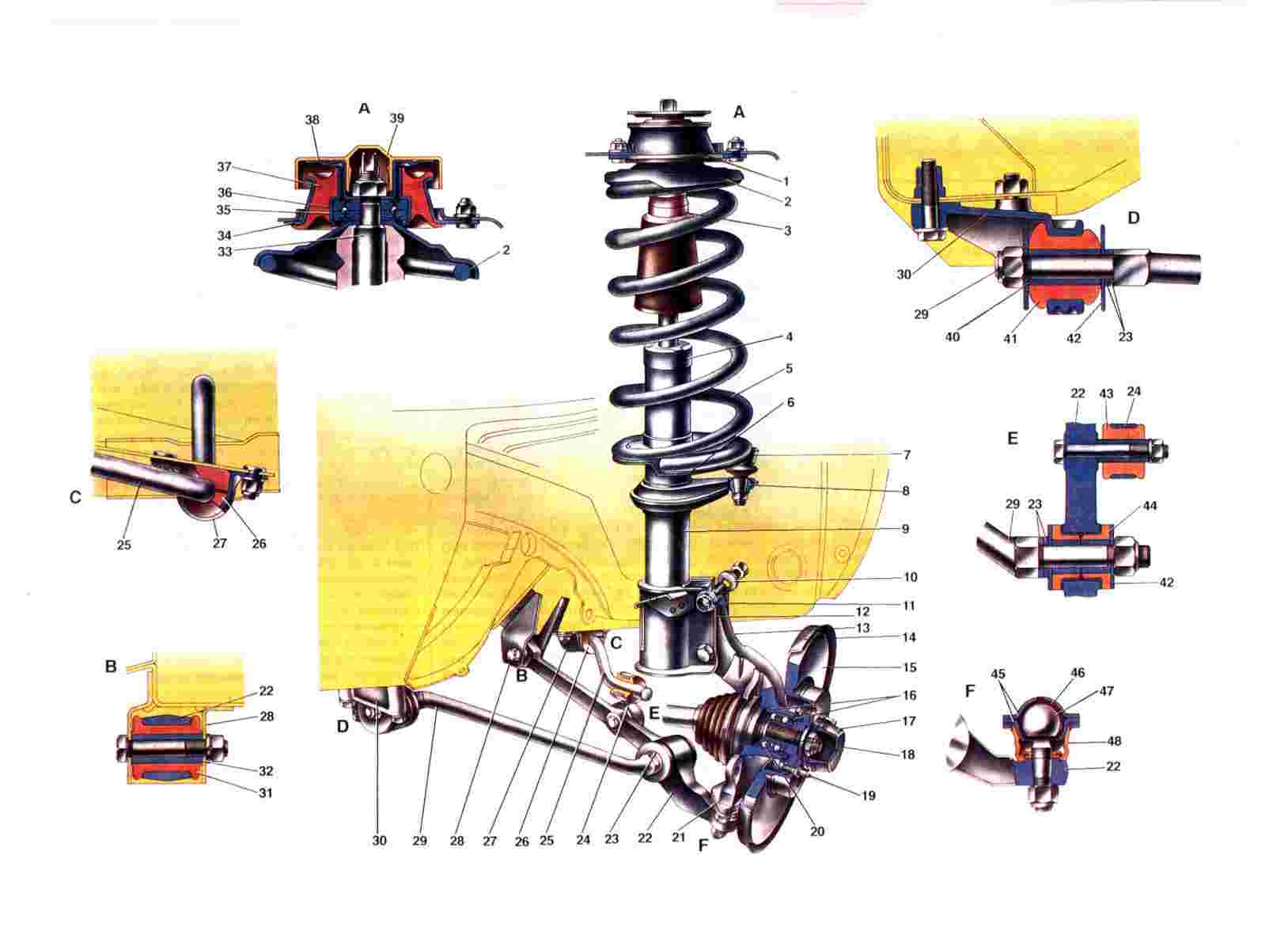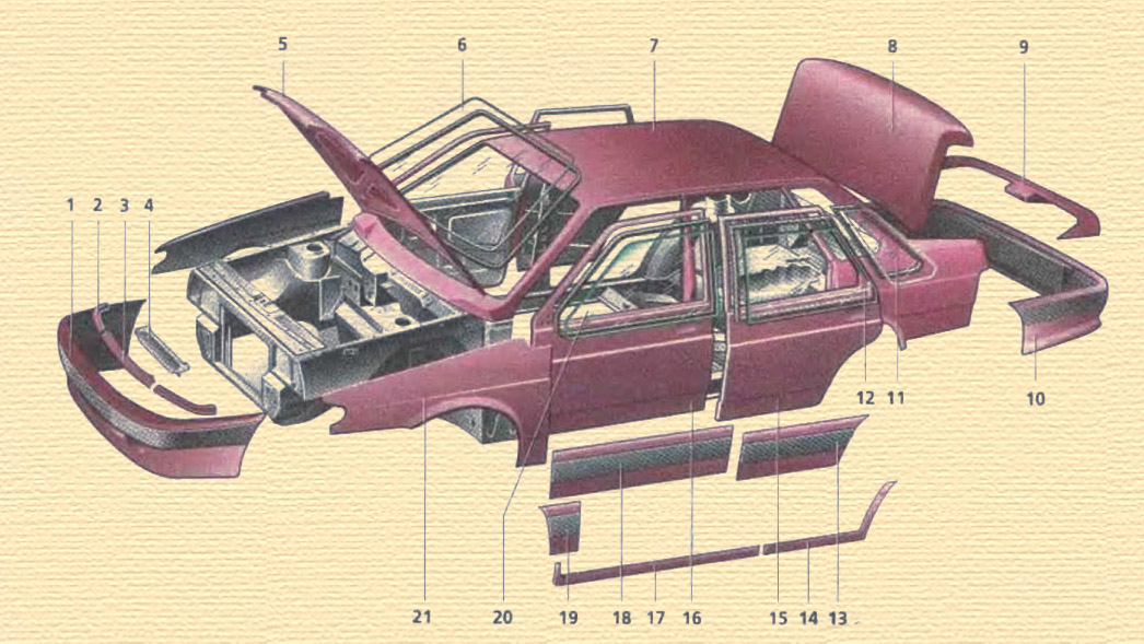Устройство автомобиля ВАЗ-21099. 1. Передний бампер; 2. Блок-фара; 3. Аккумуляторная батарея; 4. Радиатор системы охлаждения; 5. Заборник холодного воздуха; 6. Двигатель; 7. Бачок для жидкости смывателя стекол; 8. Воздушный фильтр; 9. Внутреннее зеркало заднего вида; 10. Противосолнечный козырек; 11. Плафон освещения салона; 12. Запасное колесо; 13. Задний фонарь; 14. Задний бампер; 15. Основной глушитель; 16. Амортизатор задней подвески; 17. Задний тормоз; 18. Балка задней подвески; 19. Топливный бак: 20. Дополнительный глушитель; 21. Наружное зеркало заднею вида; 22. Боковой указатель поворота; 23. Рулевой механизм; 24. Передний тормоз; 25. Телескопическая стойка передней подвески.